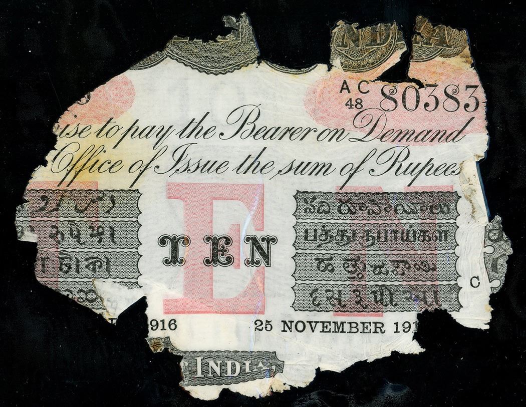 Calcutta, British India, 10 rupees, 25-1-1916, series AC 48, serial 80383, laminated. SCWPM-A10f. Partially intact (60-75%) with light staining and circular degradation pattern (typical), with full serial. With certificate from the salvager. Recovered from: Camberwell, sunk in 1917 off Isle of Wight, south of England