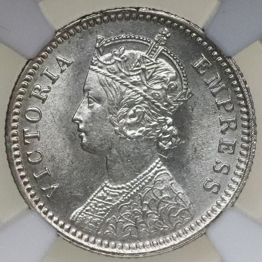 Calcutta, India (British), 1/4 rupee, Victoria, 1890-C, NGC MS 62. SW-6.297; KM-490. Frosty white surfaces, outline of bust on reverse from die clashing. NGC #5907479-002.