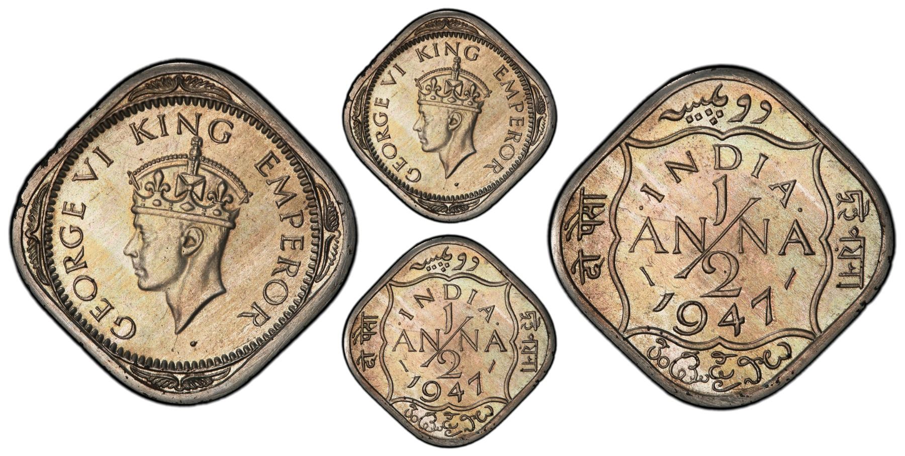 Calcutta, India (British), copper-nickel original proof 1/2 anna, George VI, 1947, very rare, PCGS PR64, finest and only example in PCGS census. S&W-9.215. Golden toning with hints of magenta and teal, a few light fiber strike-throughs but no marks or wear, second only to a single PF 65 at NGC (with just one lower at PF 63). PCGS #38543718. With original His Majesty's Mint paper envelope.
