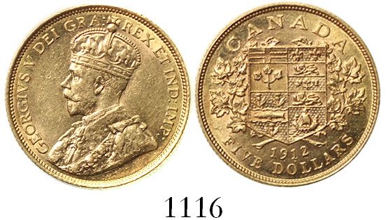 Canada, 5 dollars, George V, 1912. KM-26 8.37 grams. Lustrous and lightly red-toned Mint State with minor bagmarks.