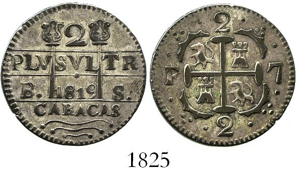 Caracas, Venezuela, 2 reales, 1819BS. KM-C6.1. 4.9 grams. AVF with alternating luster (muted) and toning.