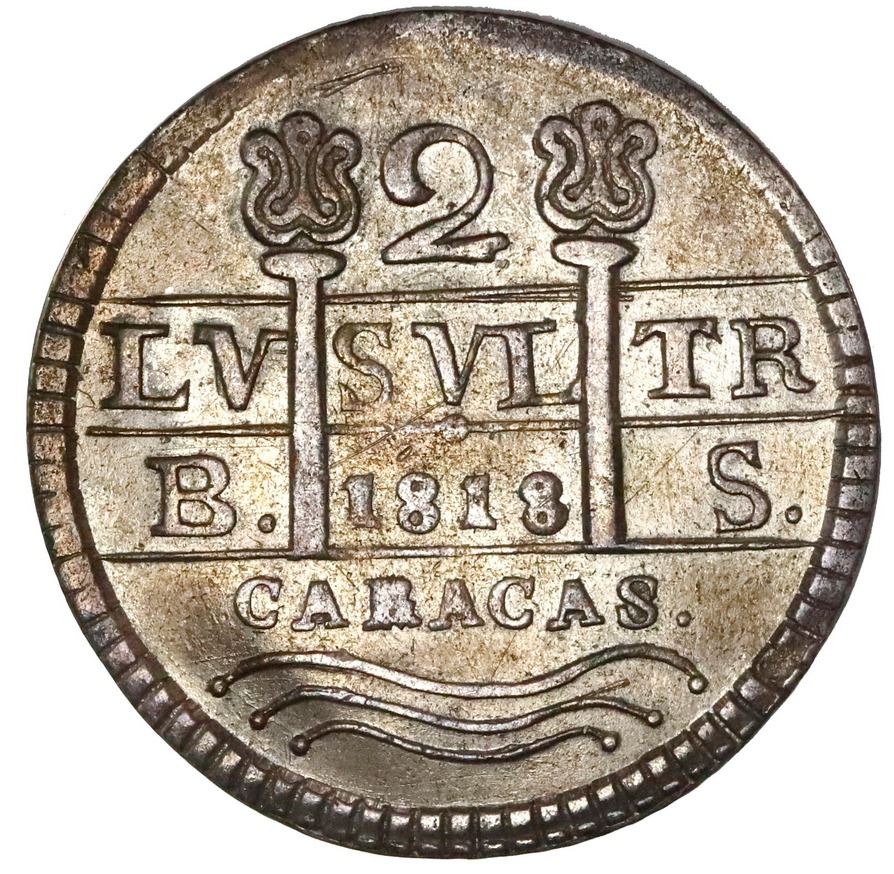 Caracas, Venezuela, 2 reales, dated 1818-BS, florets flanking cross (struck in 1830 under Gran Colom