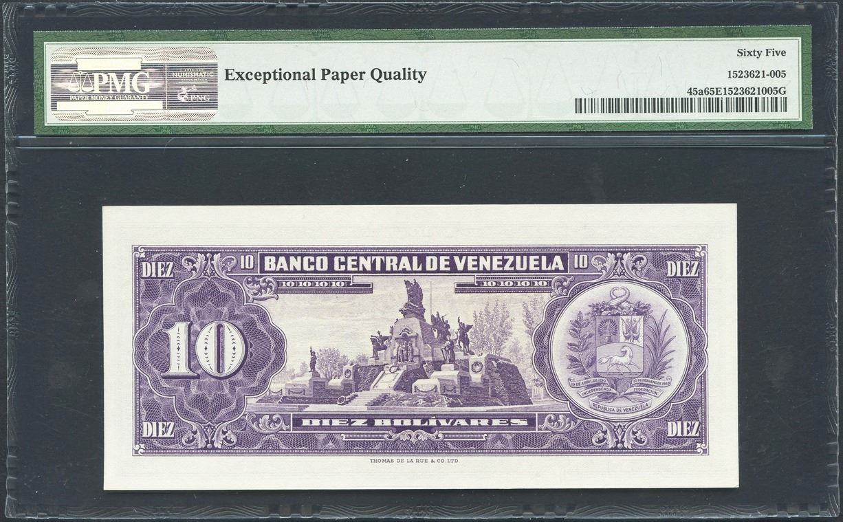 Caracas, Venezuela, Banco Central de Venezuela, 10 bolivares, 7-5-1963, certified PMG Gem UNC 65 EPQ. SCWPM-45a. Serial N3484967. Bold embossing and color. PMG #1523621-005.