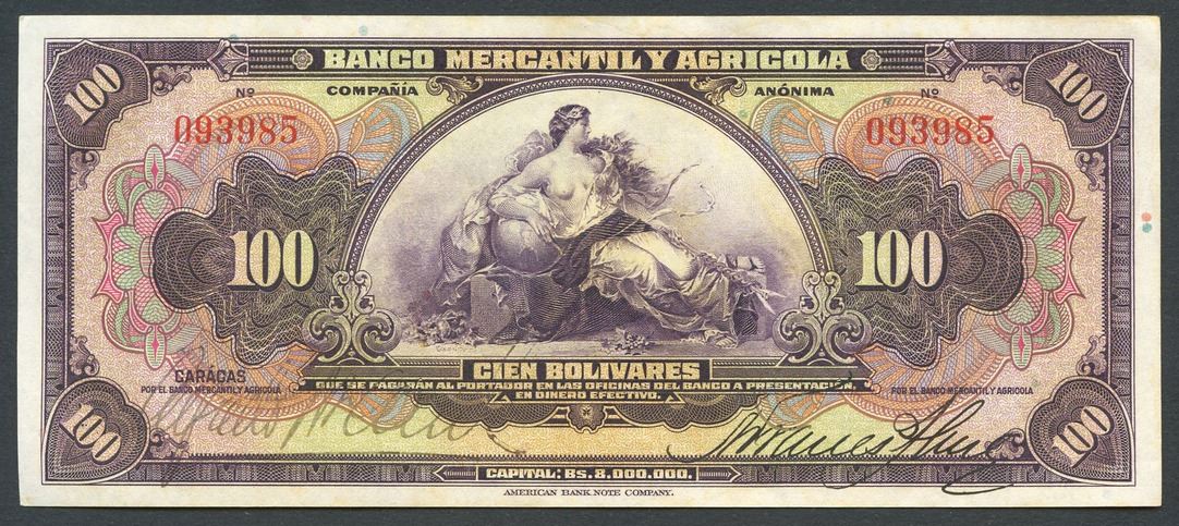 Caracas, Venezuela, Banco Mercantil Y Agricola, 100 bolivares remainder, ND (1929). SCWPM-S233r1. Serial 093985. Remainder with signatures but no date. Colorful AU+ with light handling marks and faint water staining.