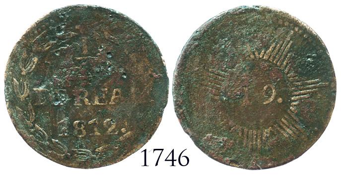 Caracas, Venezuela, copper 1/4 real, 1812, very rare. KM-C22. 3.5 grams. Dark and slightly porous Fine with clear details, some original copper color on high points.