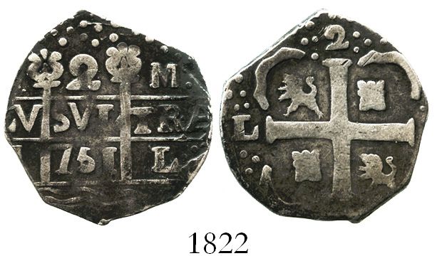 Caracas, Venezuela, "imitation cob" 2 reales, date "751" (early 1800s), rare.