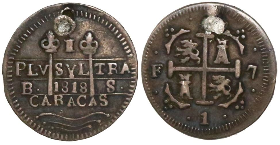 Caracas, Venezuela, royalist 1 real, Ferdinand VII, 1818BS, lions at upper left and lower right, rare. KM-5.1. 2.87 grams. Fine+ with gunmetal toning all over, plugged holed at top of cross.
