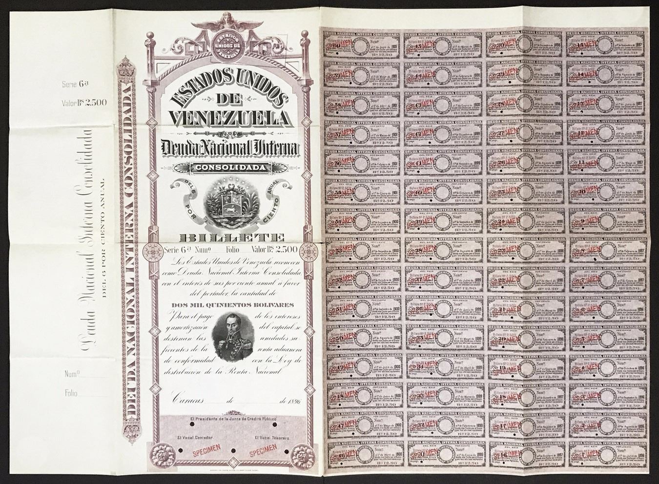 Caracas, Venezuela, specimen 2,500 bolivares six-percent national debt coupon bond, 1896. Series 6a. ABNCo printed specimen bond with all coupons attached. Folded with an internal central split, crisp paper quality and color.