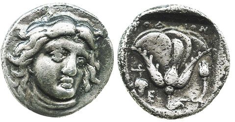 Caria, Rhodes, AR didrachm, Helios and rose, 340-316 BC.