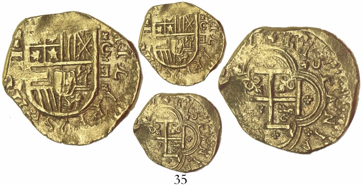 Cartagena, Colombia, cob 2 escudos, (163)2E, assayer in retrograde, rare. S-C7; KM-4.6; CT-135; Restrepo-M52.21b. 6.88 grams. Broad flan with full C-E (retrograde) to right, full shield and nearly full cross, most of 2 of date, yellow-gold AXF with luster, some crude strike. Variety with + ornaments inside and outside of tressure around cross.