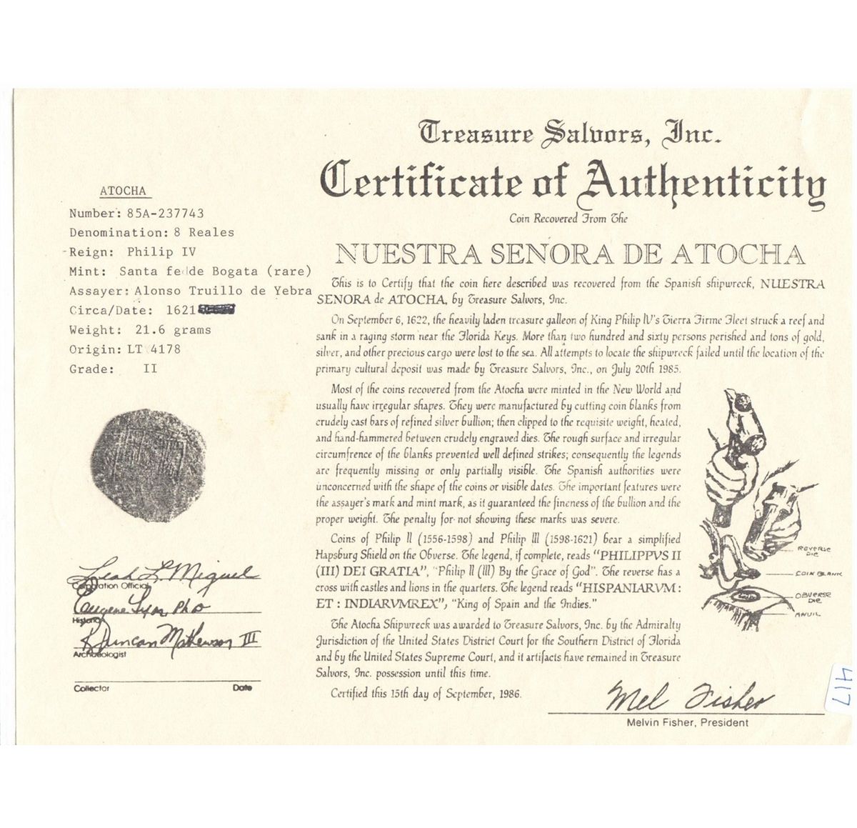 All items are genuine unless noted. Most shipwreck coins and artifacts come with a certificate of authenticity (please check the description for each item). By bidding in this auction you understand and agree to the Terms and Conditions posted here.