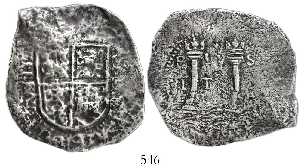 Cartagena, Colombia, cob 8 reales, 16(55)S, extremely rare. Restrepo-M48.2; S-C4; KM-7.2. 16.86 grams. Very broad, thin flan with bold full pillars and shield, full denomination VIII to left, moderately corroded but nicely toned, a seldom-offered issue that almost always comes from this wreck. Recovered from: Maravillas, sunk in 1656 off Grand Bahama Island