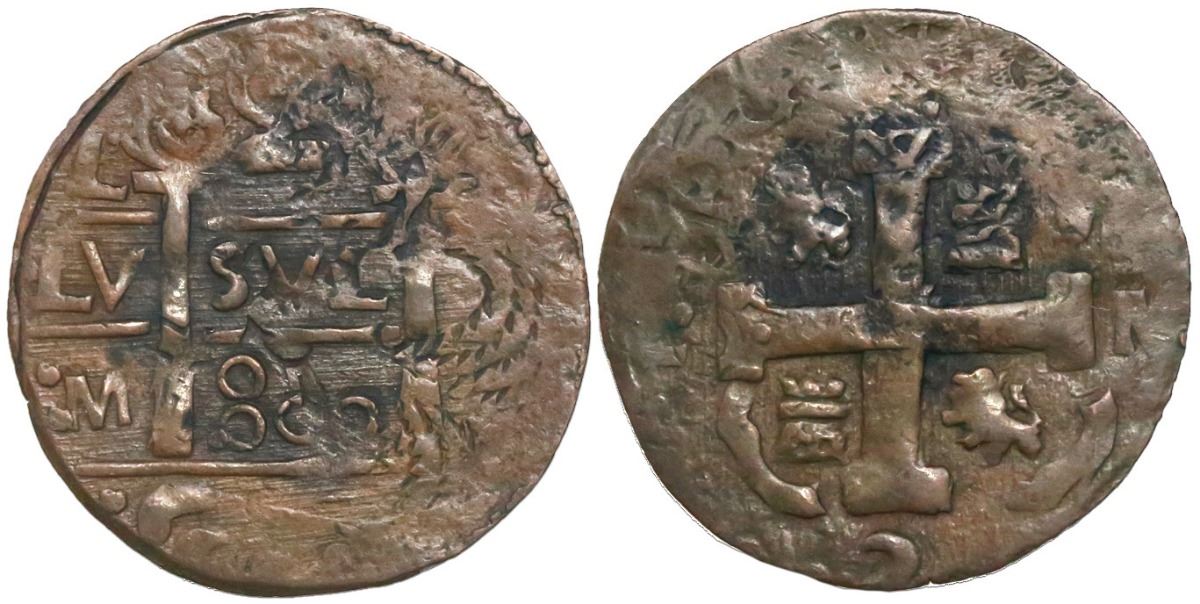 Cartagena, Colombia, copper "imitation cob" 2 reales, fantasy date "800" (ca. 1815), struck over Cartagena Republican copper 2 reales (1813-14), rare. Restrepo-118.1. 4.74 grams. This strange, ephemeral Royalist issue was struck from dies made to look like a Lima 2 reales over a provisional independent Cartagena 2 reales of 1813-14 (Restrepo-136), the present specimen with traces of the undercoin visible through full details on both sides (pillars and cross, the latter with lions and castles transposed as usual), dark XF with spots of black toning.