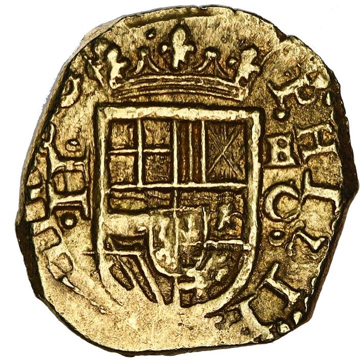 Cartagena, Colombia, gold cob 2 escudos, Philip IV, assayer E above mintmark C to right, dots inside, crosses outside tressure on reverse (1631). Restrepo-M52.16; S-C7; KM-unl; Cal-1763. 6.73 grams. Choice full crown and shield and cross, bold denomination II to left and E-C to right (an arrangement attributed to 1631 only so far), full PHILIP of king's name, the reverse just enough off-center to put the date off the edge (although the very bottom of a final digit 1 can be imagined), AU with tiny test-mark on edge.