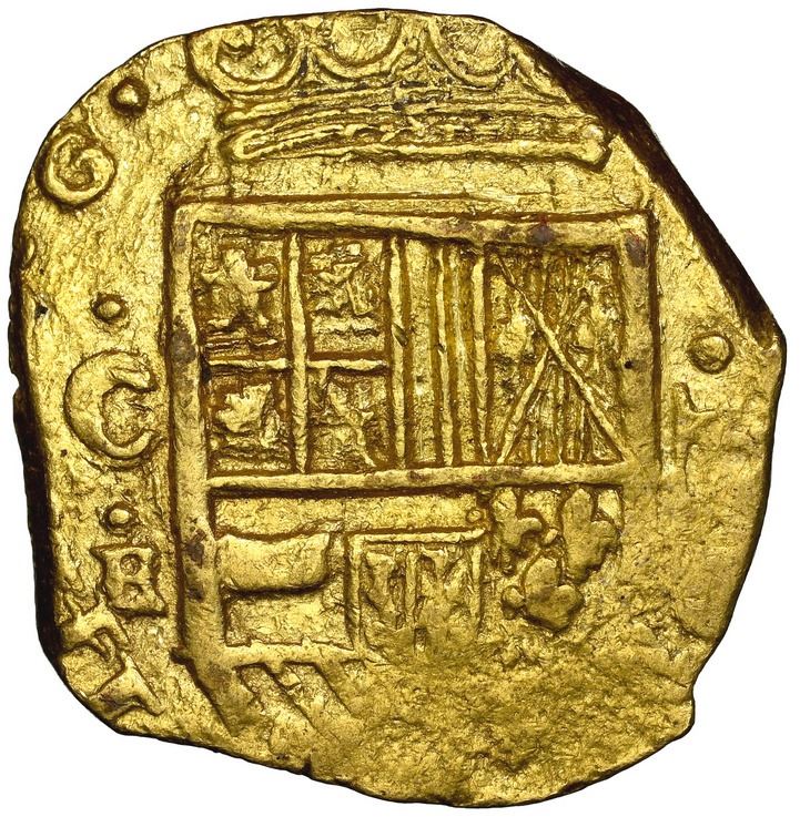Cartagena, Colombia, gold cob 2 escudos, Philip IV, assayer E below mintmark C to left, dots inside and outside tressure on reverse (1630-1), NGC MS 61, ex-Fisher, ex-Lasser. Restrepo-unl (M52 for type); S-C7; KM-4.6. 6.79 grams. Bold full C-E to left of nearly full shield below nearly full crown, just enough of the denomination to right to see that it is the "normal" version (II sideways, not upright), also part of king's ordinal II in legend, the cross-and-tressure complete and well struck, just no part of the date in the legend (but this variety with dots inside and outside the tressure only known for 1630 and 1631, strangely missing in Restrepo with the CE2 obverse), lustrous all over. Note that the Fisher tag and certificate call it "Lasser plated coin" based on what was probably a "fill-down" typographical error in the Ponterio catalog. Pedigreed to the Joseph R. Lasser Collection (Ponterio auction of January 2006, lot 403), with original Mel Fisher tag and photo-certificate PC6-30970.