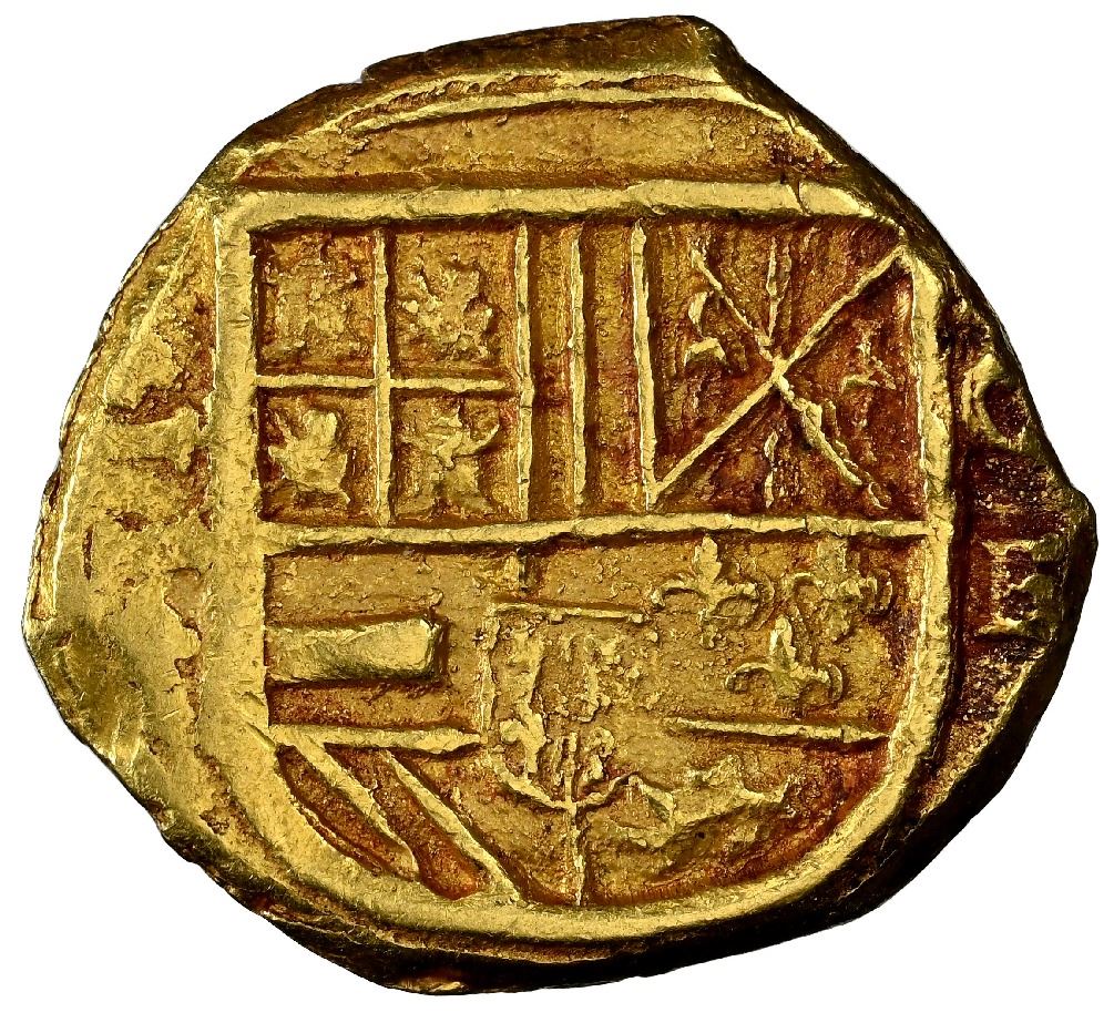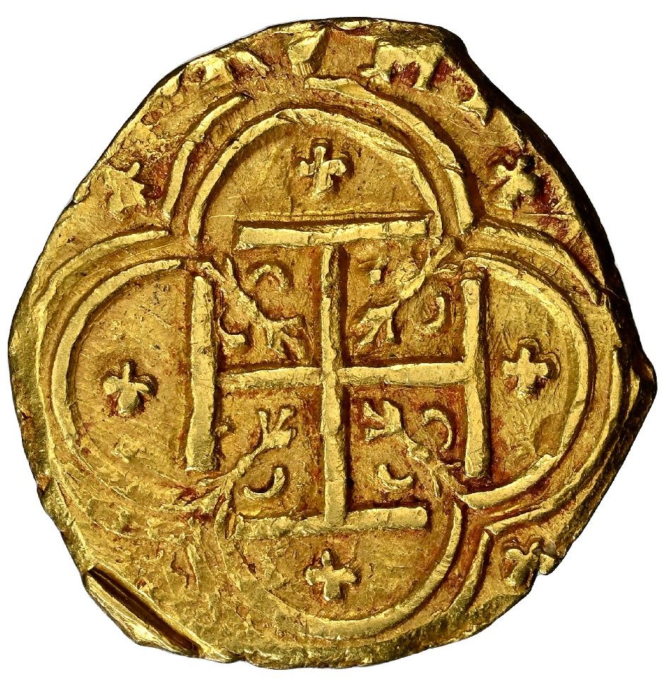 Cartagena, Colombia, gold cob 2 escudos, Philip IV, assayer E below mintmark C to right, crosses inside and outside tressure around cross, NGC MS 62. Restrepo-M52.31; S-C7; KM-4.6; Cal-Type 378. 6.78 grams. Very bold full shield (stained red in crevices) with clear C-E to right and denomination II (reading vertically) to left, choice full cross and tressure and +'s inside and outside. (Note: Confusingly, the NGC census calls this "top pop" within a date range of 1630-35, whereas other examples of C-E like the previous lot were put under 1628-35, which tops out at MS 64.)