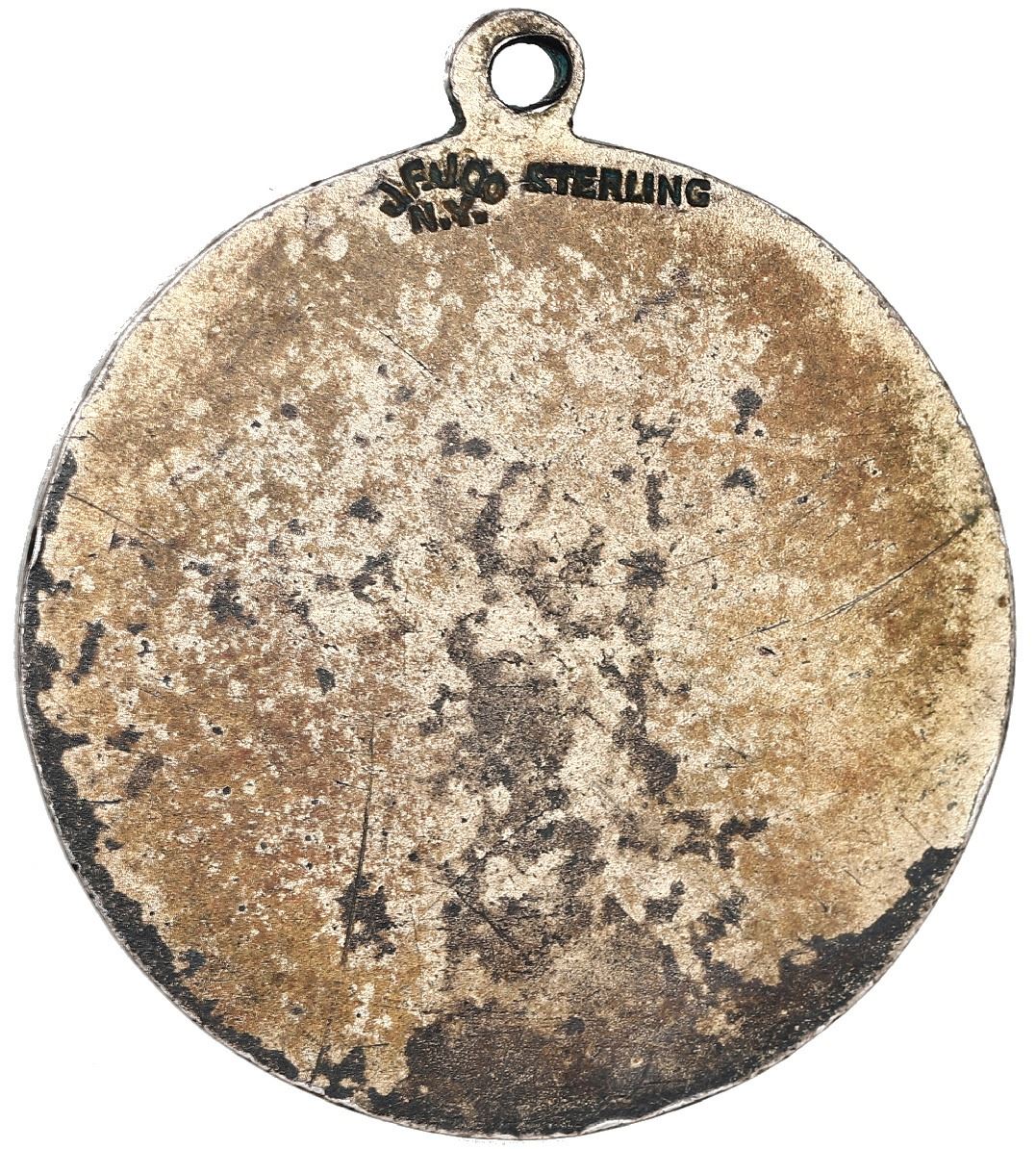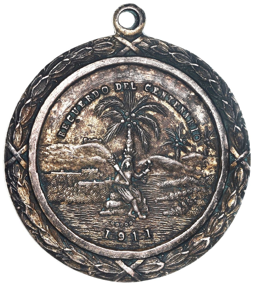Cartagena, Colombia (made in New York City for Club Cartagena), uniface silver medal with loop, 1911, Independence Centennial, rare. 11.50 grams; 29mm. Obverse with native-and-palms arms of Cartagena below RECUERDO DE CENTENARIO inside solid ring with wreath beyond; reverse blank but with stamps J.F.J. Co / N.Y. and STERLING at top below integrated loop. Made by the John Frick Jewelry Company in New York City for Club Cartagena in honor of the centennial of Cartagena's independence. Deeply toned AU, similar to one featured on the cover of NumisCol's Boletin Numismatico 90 (2011), but with the additional wording for Club Cartagena at top removed (traces still visible).