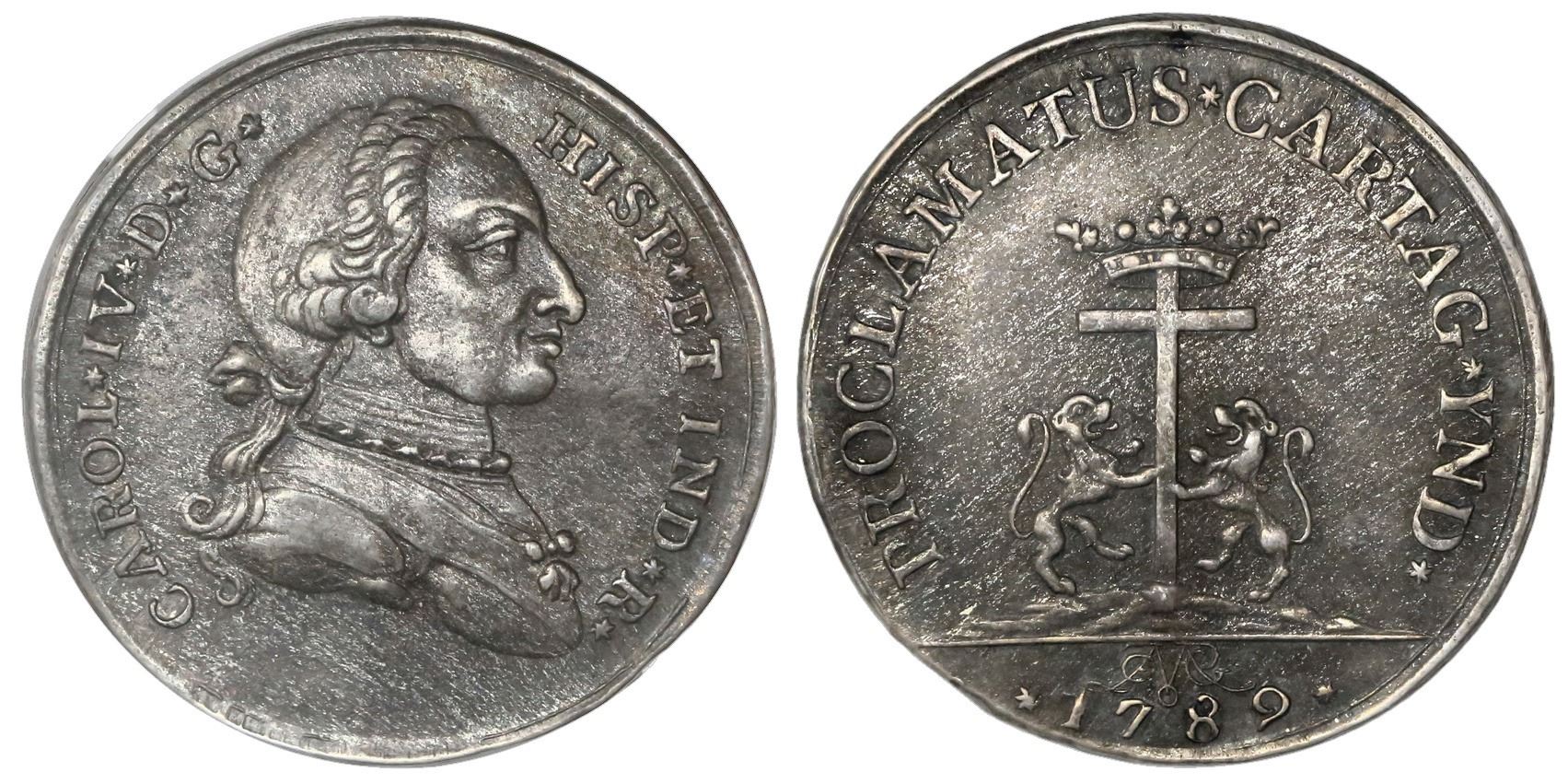 Cartagena, Colombia, silver 4R-sized proclamation medal, Charles IV, 1789, NGC AU 53.