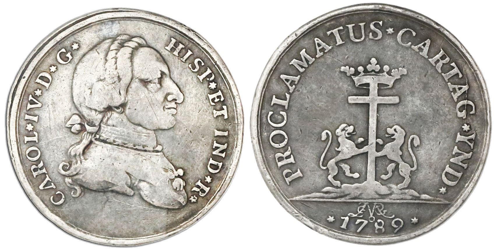 Cartagena, Colombia, silver 4R-sized proclamation medal, Charles IV, 1789, NGC VF details / repaired