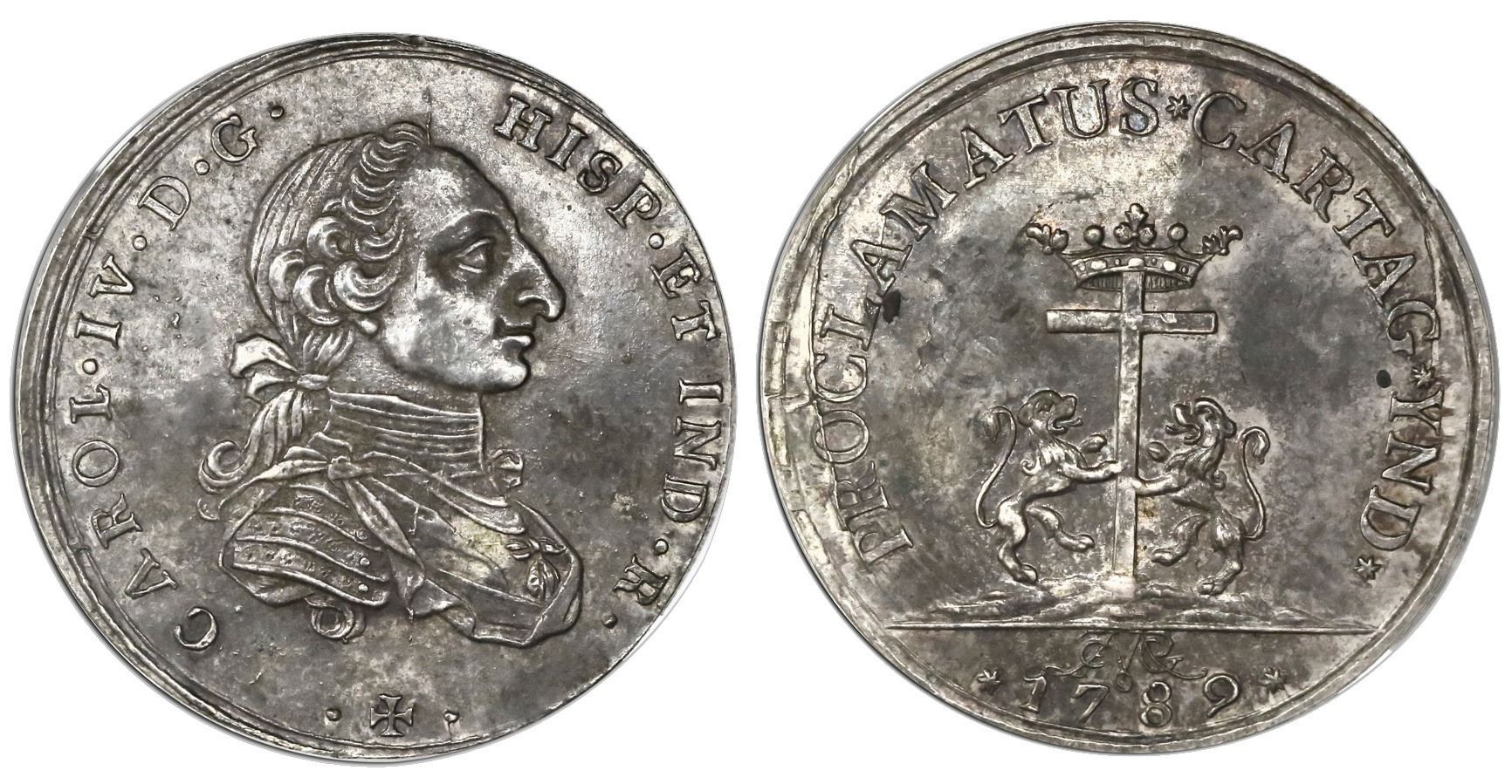 Cartagena, Colombia, silver 4R-sized proclamation medal, Charles IV, 1789, coin axis (rare), NGC AU 58, finest known in NGC census. Restrepo-p. 121; Herrera-126; Medina-138. 33mm. Obverse with armored bust of Charles III [sic] within legend CAROL.IV.D.G. HISP.ET IND.R. with Maltese cross at bottom (same die as Bogota issues); reverse with crowned cross supported by lions within legend PROCLAMATUS * CARTAG * IND * with date *1789* below monogram (Camargo?) in exergue. Choice deep toning over muted luster, same tiny spots of extra metal on obverse as on previous lot and die-crack on PROCLA on reverse, coin-axis alignment not noted on label nor in previous sales (potentially quite rare). Pedigreed to the Santander Collection (stated on label). NGC #4743181-003. The Santander Collection of Colombian Proclamation Medals