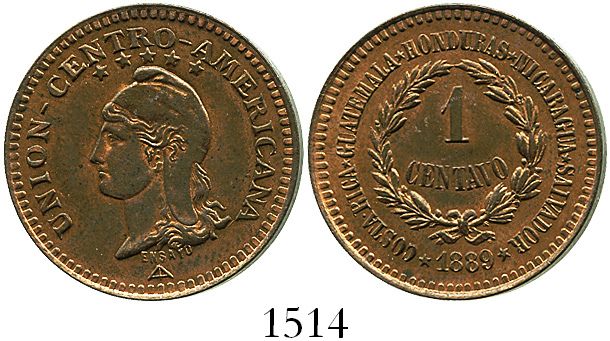 Central American Union, bronze essai 1 centavo, 1889. KM-E21. 5.0 grams. UNC with bright original color and luster. The Central American Union was a short-lived entity consisting of Costa Rica, Guatemala, Honduras, Nicaragua, and El Salvador.