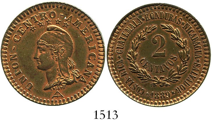 Central American Union, bronze essai 2 centavos, 1889. KM-E22. 9.9 grams. UNC with original color and luster. The Central American Union was a short-lived entity consisting of Costa Rica, Guatemala, Honduras, Nicaragua, and El Salvador.