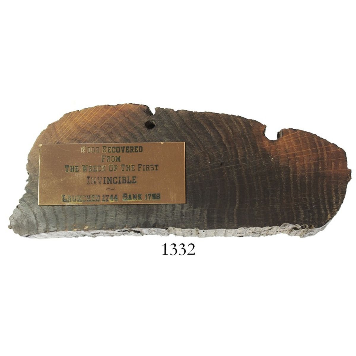 Charred cross-section of wood from the ship. 292 grams, 3" x 8". A New York strip-shaped hunk of solid, dark (burned) wood with three rubber feet on bottom and brass plaque on top, a nice conversation piece. Recovered from:HMS Invincible, sunk in 1758 in the East Solent, south of England