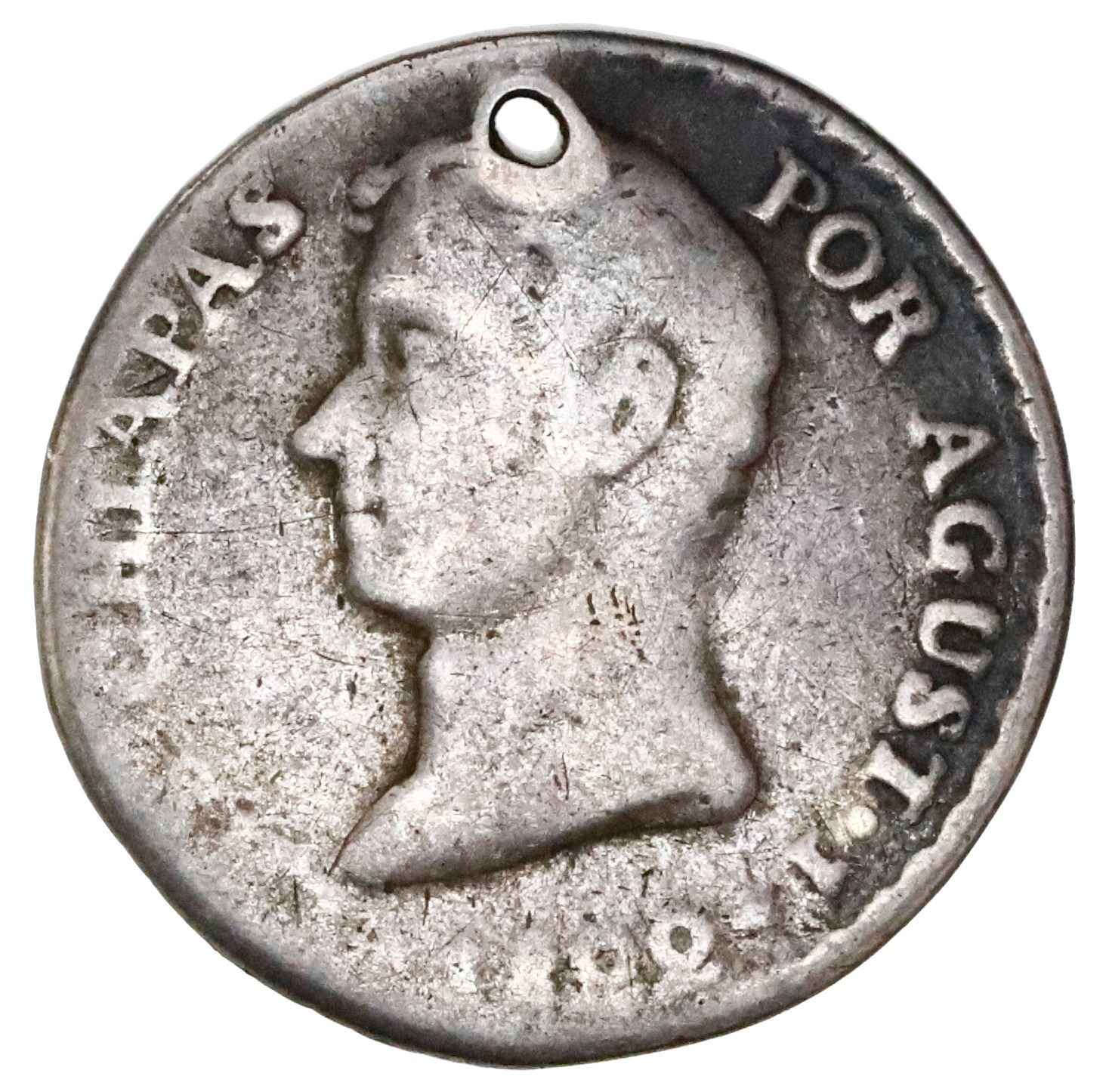 Chiapas, Mexico (Empire), 1R-sized proclamation medal, 1822, Iturbide. Grove-23a. 3.12 grams. Obverse: left facing bust of Iturbide, LAS CHIAPAS POR AGUST. I encircling, with date 1822 below; reverse: royal coat of arms at center with CHIAPAS PROCLAMAN CONSTANCIA. encircling; smooth edge. Holed VG.