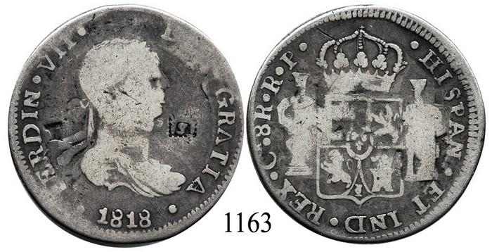 Chihuahua, Mexico (War for Independence), bust 8 reales, Ferdinand VII, 1818RP, with countermarks T and pillars/pomegranate on obverse. KM-111.1. 25.6 grams. Pedigreed to Ponterio auction #76, lot #1026. Typically crude strike, Fine for issue, attractive toning.