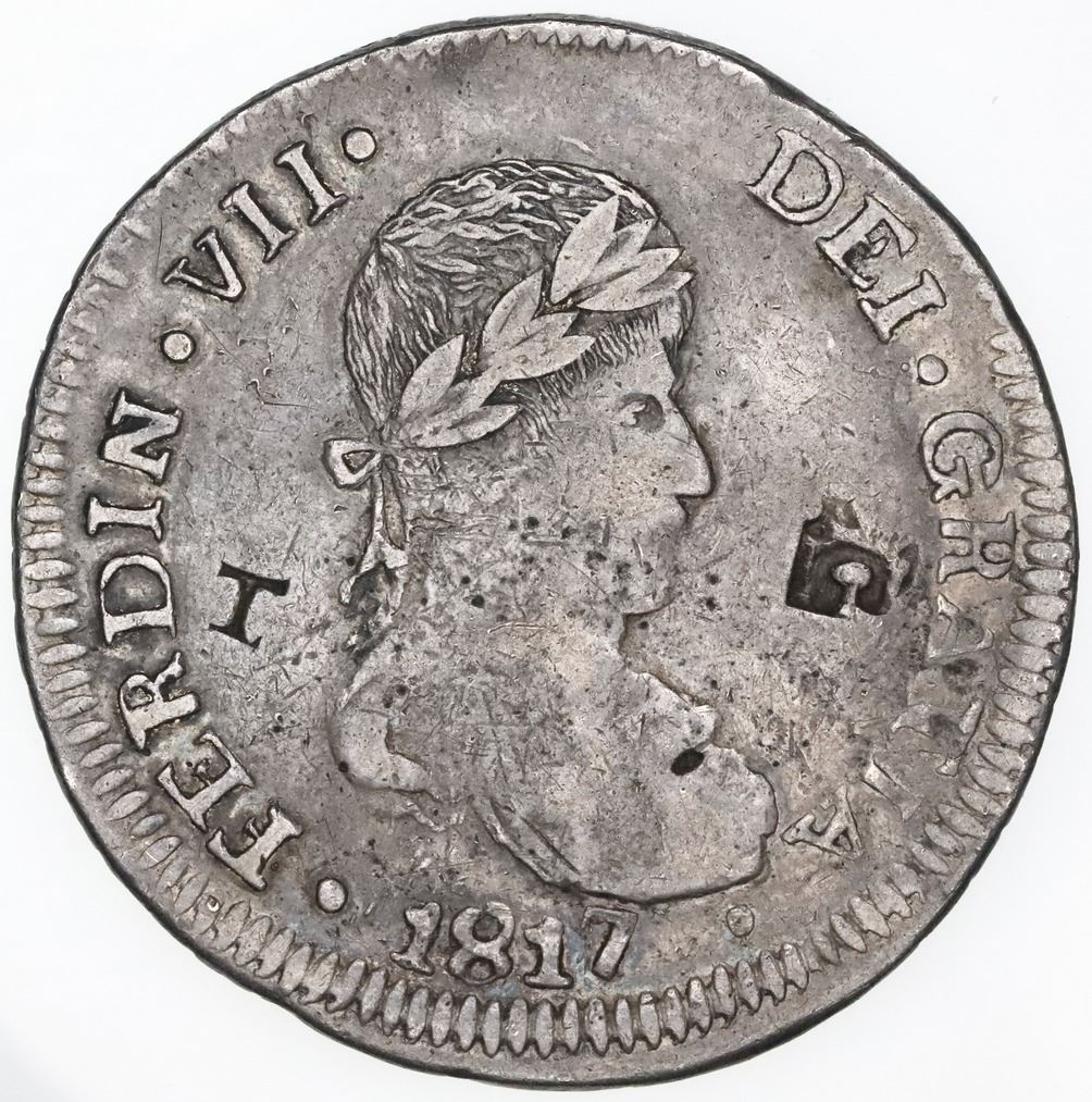 Chihuahua, Mexico, bust 8 reales, Ferdinand VII, 1817RP, with incuse T and pillars/pomegranate count