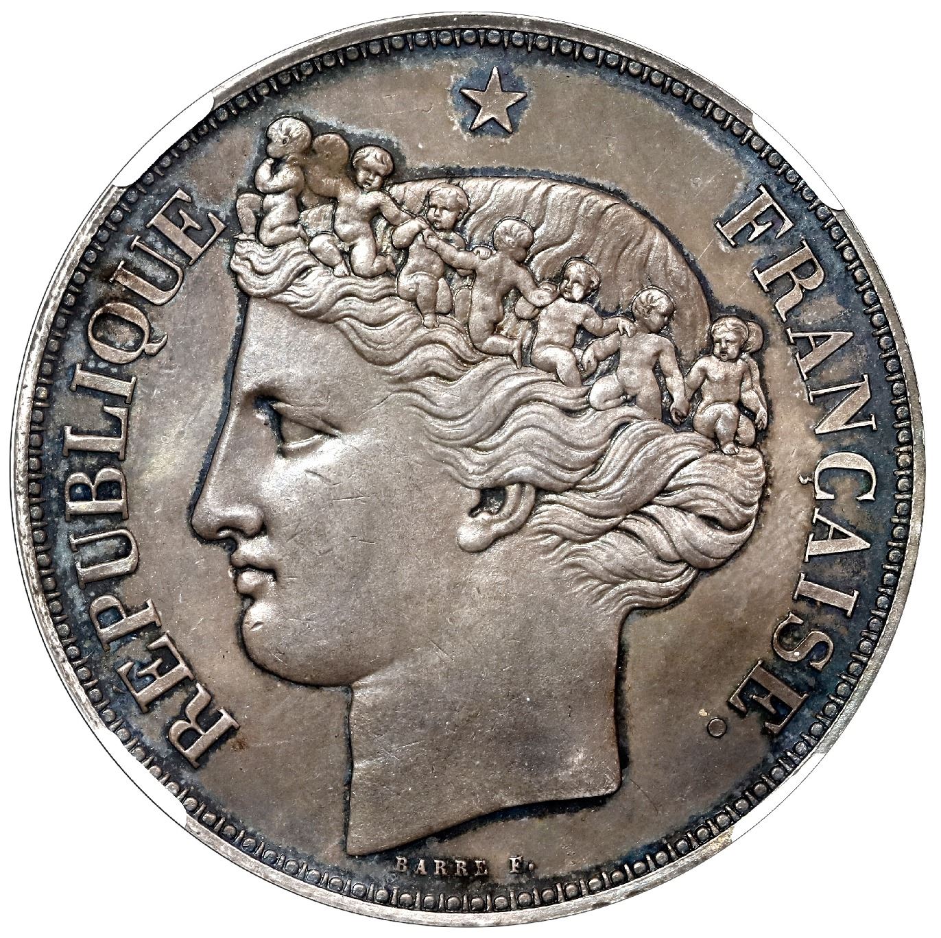Chile (struck at the Paris Mint in France), silvered bronze uniface obverse essai (5 francs), 1851, rare, NGC MS 61, finest and only example in NGC census. Maz-1267B var; KM-Pn9 var. Deeply rainbow toned over rather muted luster, no wear and only a couple tiny marks, an interesting pattern struck for Chile in the French design by the famous engraver Barre (whose name appears below the bust) in a unique design with Lady Liberty wearing a crown of cherubs.