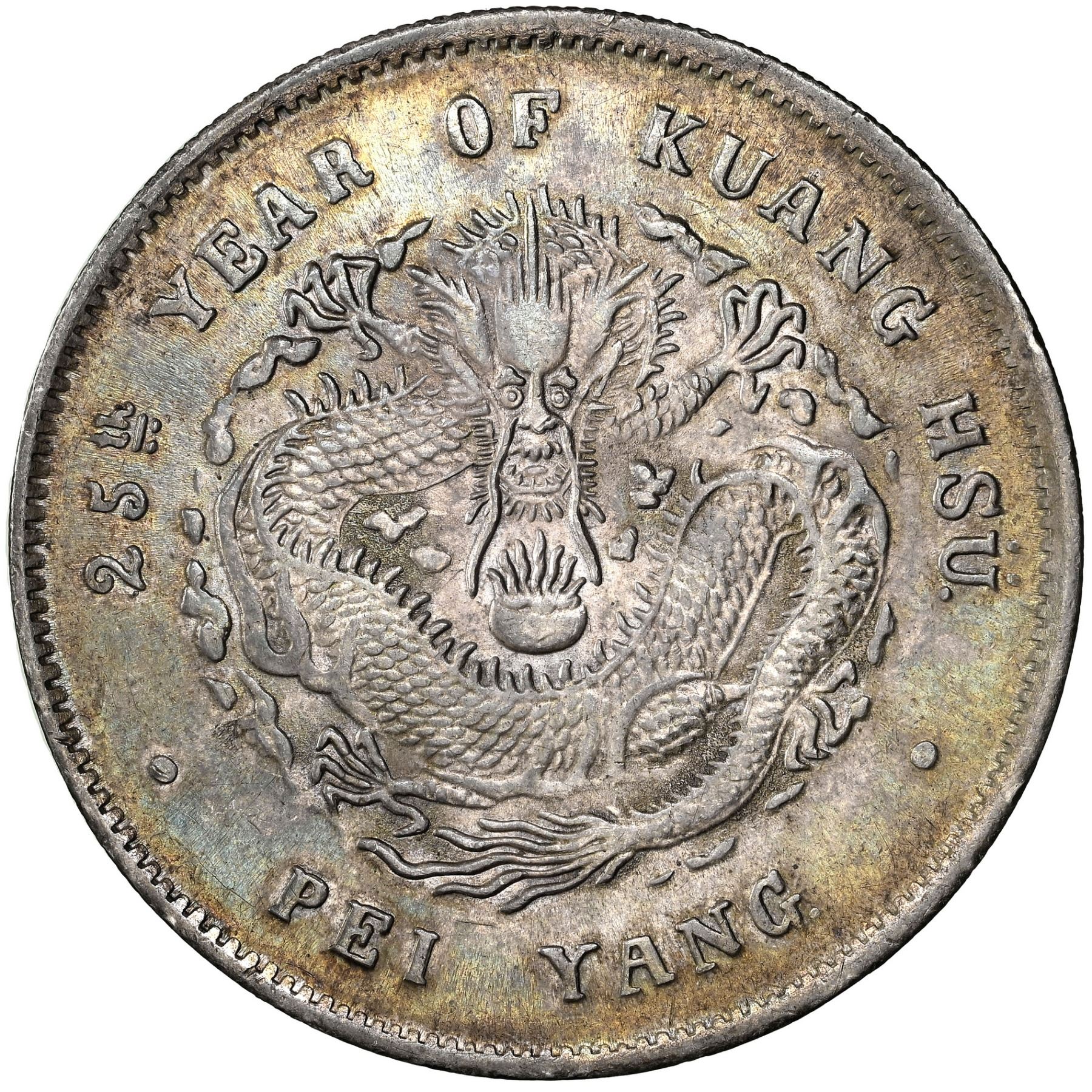 China (Empire), Chihli Province (Pei Yang), 7 mace 2 candareens (1 dollar), Kuang-hsu (Guangxu), year 25 (1899), Tientsin (East Arsenal) mint, NGC AU 58. L-M-454; KM-Y73. Subtly lustrous with light and colorful toning all over, scarce and desirable issue that always garners a premium, especially for straight-number grades like we see here.
