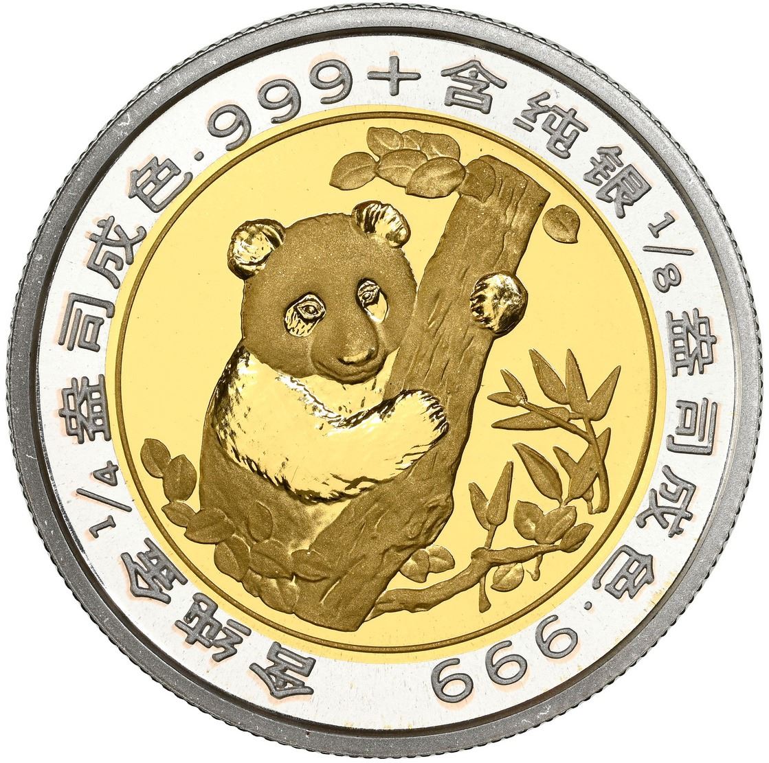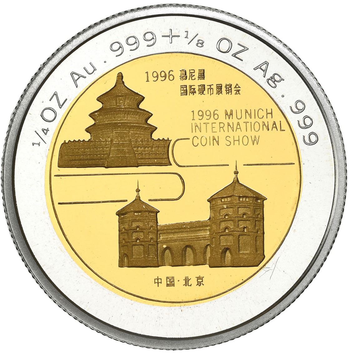 China (People's Republic), bimetallic proof official Panda issue, 1/4 oz gold, 1/8 oz silver, 1996, Munich International Coin Show, NGC PF 69 Ultra Cameo ("top pop"). KM-XMB83; PAN-277A. None graded higher in the current NGC census. As mentioned previously, there is confusion over the name of the show for which this issue was released, this year bearing the lettering MUNICH INTERNATIONAL COIN SHOW despite the show's proper name of NUMISMATA. Mintage: 1,500 (planned; actual and surviving unknown). Pedigreed to the Gansu Collection of Chinese Panda Coinage.