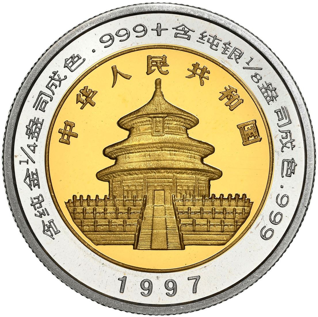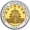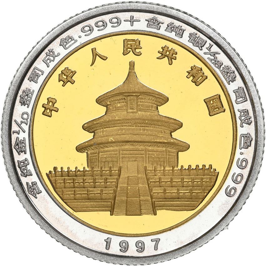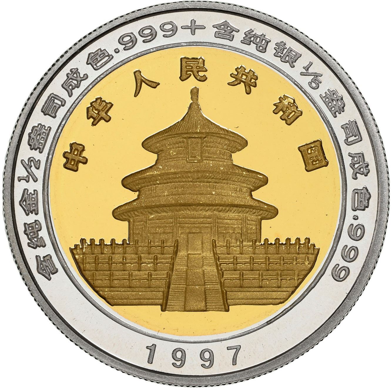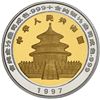 China (People's Republic), bimetallic proof three-coin Panda denomination set (10, 25, and 50 yuan), 1997, all NGC PF Ultra Cameo, 69, 68 and 69 respectively. KM-998, 999, 1000; PAN-286A, 287A, 288A. The 50 yuan is "top pop" (none higher) with only one higher 10 yuan at PF 70 in the current NGC census. Mintage: 2,800 (planned; actual and surviving unknown). Pedigreed to the Gansu Collection of Chinese Panda Coinage.