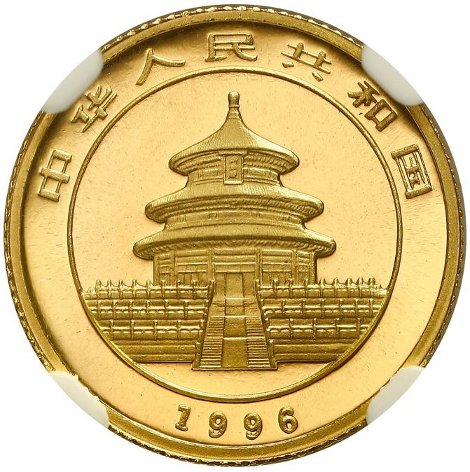 China (People's Republic), gold 10 yuan (1/10 oz) Panda, 1996, small date (Shanghai mint), NGC MS 69. KM-884; PAN-259A. Only three higher at MS 70 in the current NGC census. Note in this year the large and small dates flip-flopped mints from previous years, the small date being Shanghai and the large date being Shenyang, which continued for the following years. This coin was graded without variety by NGC. Mintage for both mints: 57,203; estimated extant population for this variety <2,700. Pedigreed to the Gansu Collection of Chinese Panda Coinage.