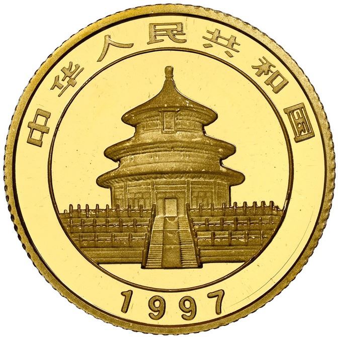 China (People's Republic), gold 10 yuan (1/10 oz) Panda, 1997, large date (Shenyang mint), NGC MS 69