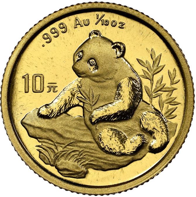 China (People's Republic), gold 10 yuan (1/10 oz) Panda, 1998, small date (Shanghai mint), NGC MS 69. KM-1127; PAN-306A. The entire 1998 series is rare, and the mintage for this denomination was particularly low. Anthony: "1998 has become perhaps the most sought-after year for gold Pandas. All the coins from this year are key coins in their sets." Only eight are graded higher at MS 70 in the NGC census. Actual mintage for both mints: 8,502; estimated extant population for this variety <4,900. Pedigreed to the Gansu Collection of Chinese Panda Coinage.
