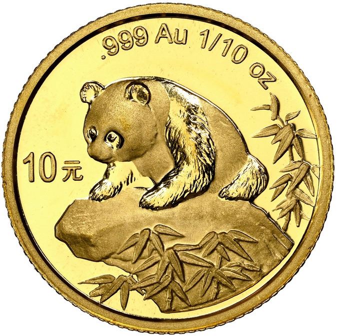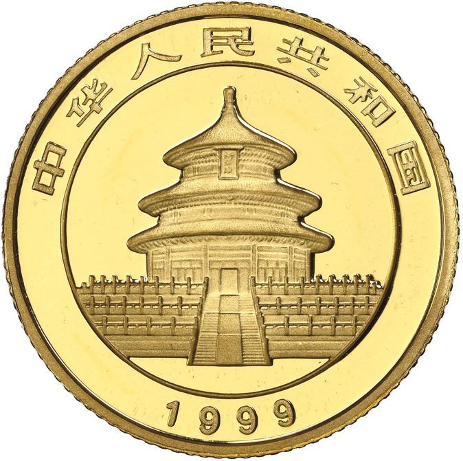 China (People's Republic), gold 10 yuan (1/10 oz) Panda, 1999, large date plain 1 (Shenyang mint), N