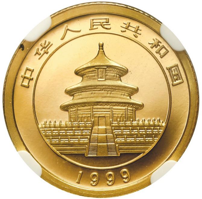 China (People's Republic), gold 10 yuan (1/10 oz) Panda, 1999, large date serif 1 (Shenzen Guobao mint), NGC MS 69. KM-1218; PAN-319C. New third-mint variety with very low survival estimate, only two higher at MS 70 in the current NGC census. Anthony: "The 1999 10 Yuan 1/10 oz. gold Large Date Panda Serif 1 is a very important coin." Actual mintage for all the mints: 25,501; estimated extant population for this variety <650. Pedigreed to the Gansu Collection of Chinese Panda Coinage.