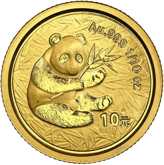 China (People's Republic), gold 10 yuan (1/10 oz) Panda, 2000, frosted ring (Shenyang mint), NGC MS 69. KM-1304; PAN-329A. Anthony: "Like the 1998 and 1999 Pandas the 2000 was caught in the wake of the Asian financial crisis. Demand for gold Pandas plummeted and many are reported to have been melted. In addition there were cross-currents unique to this year as many coins were bought by non-collectors as keepsakes of the turn of the millennium." Actual mintage for both mints: 44,511; estimated extant population for this variety <8,500. Pedigreed to the Gansu Collection of Chinese Panda Coinage.