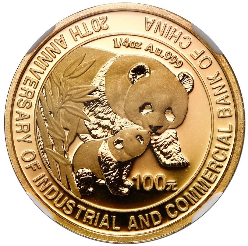 China (People's Republic), gold 100 yuan (1/4 oz) Panda, 2004, Industrial and Commercial Bank of China 20th Anniversary, NGC MS 70 ("top pop"), ex-Gansu. Fr-B16; KM-1540; PAN-384A. Perfect example of this commemorative Panda, tied with just five others for finest known in the NGC census. Mintage: 50,000 (planned; actual and surviving unknown). Pedigreed to the Gansu Collection of Chinese Panda Coinage.