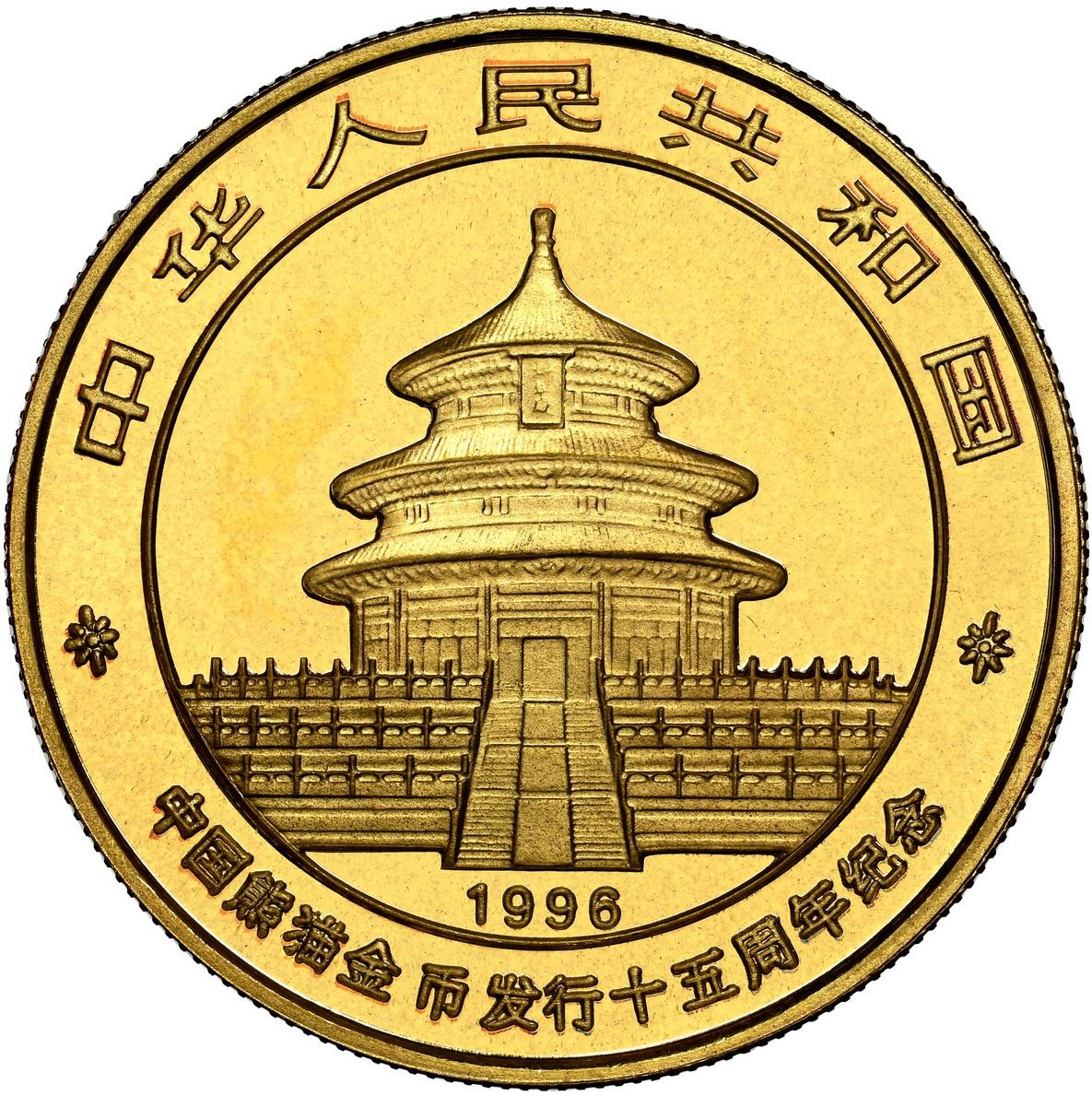 China (People's Republic), gold 100 yuan (1 oz) Panda, 1996, 15th Anniversary of the Issuance of Chi