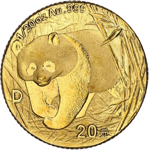 China (People's Republic), gold 20 yuan (1/20 oz) Panda, 2001 D, NGC MS 69. KM-1366; PAN-345A. The "D" mark (used only in this year) indicated production for domestic use as opposed to export. Naturally they are elusive outside of China. Anthony: "The 2001D 20Y 1/20 oz. B.U. gold Panda has no announced mintage and it is a fairly scarce coin today." Mintage: 100,000 planned (estimated extant <6,000). Pedigreed to the Gansu Collection of Chinese Panda Coinage.