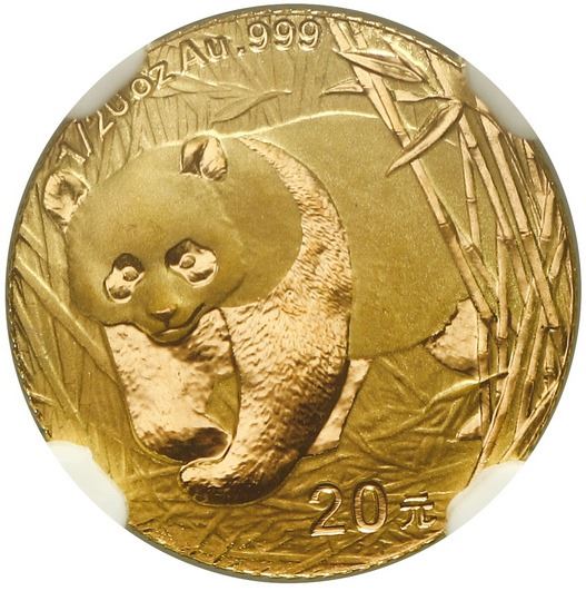 China (People's Republic), gold 20 yuan (1/20 oz) Panda, 2002, frosted bamboo (Shenzen Guobao mint), NGC MS 69. KM-1366; PAN-353B. Only one higher at MS 70 in the current NGC census specifically for this variety (but many more without specified variety). All the MS gold of 2002 are scarce, and 2002 is a key year in general (in fact the only year to repeat the design from the previous year, albeit with a new edge-reeding that is diagonal instead of vertical). The "mirrored bamboo" versions, referring to branch tips at the rim, are accompanied by a lower neckline on the panda and indicate Shanghai mint; the "frosted bamboo" versions come from the Shenzen mint. Mintage for both mints: 200,000 planned; 74,601 actual; estimated extant (both varieties) <5,700. Pedigreed to the Gansu Collection of Chinese Panda Coinage.