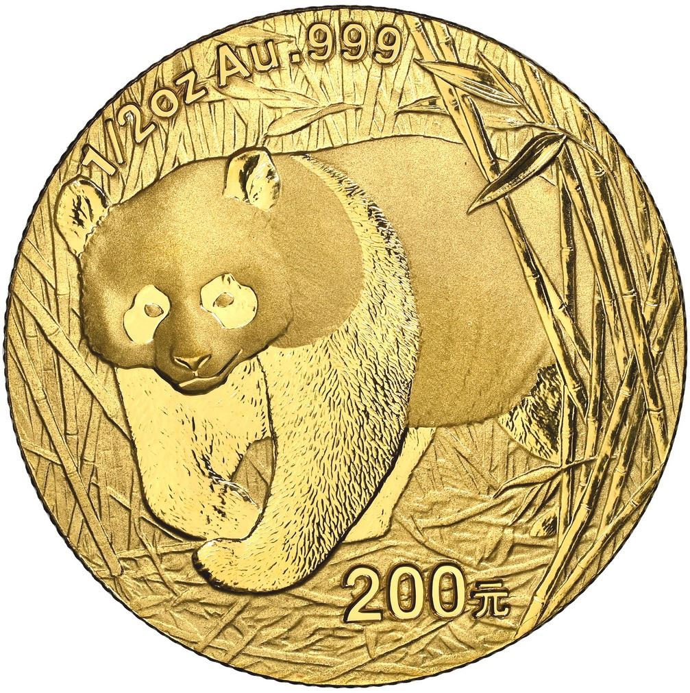 China (People's Republic), gold 200 yuan (1/2 oz) Panda, 2002, frosted bamboo (Shenzen Guobao mint),