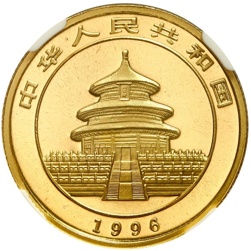 China (People's Republic), gold 25 yuan (1/4 oz) Panda, 1996, small date (Shanghai mint), NGC MS 69. KM-885; PAN-258A. Only four higher at MS 70 in the current NGC census. Note in this year the large and small dates flip-flopped mints from previous years, the small date being Shanghai and the large date being Shenyang, which continued for the following years. Mintage for both mints: 17,589; estimated extant population for this variety <2,650. Pedigreed to the Gansu Collection of Chinese Panda Coinage.