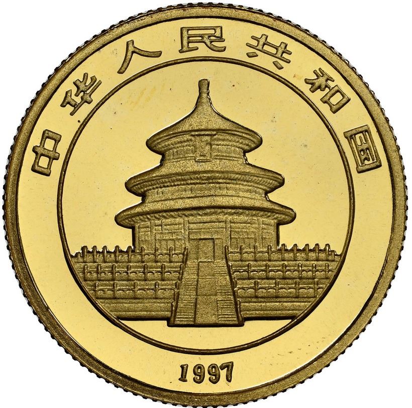 China (People's Republic), gold 25 yuan (1/4 oz) Panda, 1997, small date (Shanghai mint), NGC MS 68. KM-989; PAN-281A. Anthony: "among the scarcer dates… only a small fraction of these coins have apparently survived." Actual mintage for both mints: 21,909; estimated extant population for this variety <2,300. Pedigreed to the Gansu Collection of Chinese Panda Coinage.