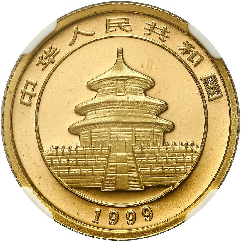 China (People's Republic), gold 25 yuan (1/4 oz) Panda, 1999, large date serif 1 (Shenzen Guobao mint), NGC MS 69. KM-1219; PAN-318C. New third-mint variety, only fifteen higher at MS 70 in the current NGC census. Anthony: "The 1999 25 Yuan 1/4 oz. gold Large Date Panda Serif 1 is a very important coin." Actual mintage for all the mints: 18,013; estimated extant population for this variety <1,250. Pedigreed to the Gansu Collection of Chinese Panda Coinage.