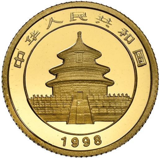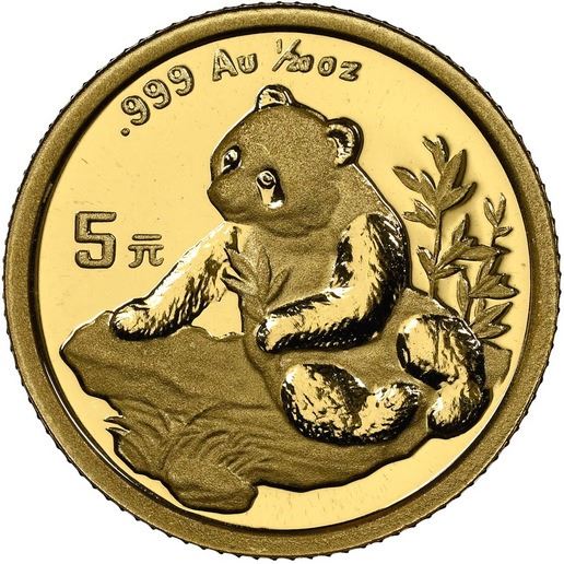 China (People's Republic), gold 5 yuan (1/20 oz) Panda, 1998, large date (Shenyang mint), NGC MS 69. KM-1125; PAN-307B. The entire 1998 series is rare. Anthony: "1998 has become perhaps the most sought-after year for gold Pandas. All the coins from this year are key coins in their sets." Actual mintage for both mints: 27,483; estimated extant population for this variety <1,900. Pedigreed to the Gansu Collection of Chinese Panda Coinage.