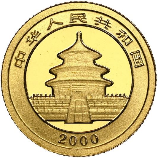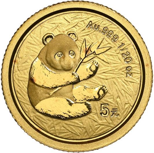China (People's Republic), gold 5 yuan (1/20 oz) Panda, 2000, frosted ring (Shenyang mint), NGC MS 69. KM-1302; PAN-330A. Anthony: "Like the 1998 and 1999 Pandas the 2000 was caught in the wake of the Asian financial crisis. Demand for gold Pandas plummeted and many are reported to have been melted. In addition there were cross-currents unique to this year as many coins were bought by non-collectors as keepsakes of the turn of the millennium." Actual mintage for both mints: 41,837; estimated extant population for this variety <7,750. Pedigreed to the Gansu Collection of Chinese Panda Coinage.
